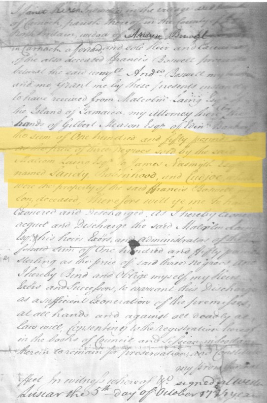 `I Janet Kirk an Indweller in the village and parish of Carnock, parish thereof in the County of ffife North Britain, widow of Andrew Boswell weaver in Carnock aforsaid, and sole Heir and Executrix of the also deceased ffrancis Boswell procreate betwixt the said umqull (late) Andw my husband and me, Grant me by these presents instantly to have Received from Malcolm Laing Esqr of the Island of Jamaica, my attorney there (by the hands of Gilbert Meason Esqr of Edinr Bankers) the sum of One hundred and fifty pounds Stg as the price of three negroes sold by the said Malcolm Laing Esqr to James Nasmyth Esqr named Sandy, Robinhood, and Cudjoe, which were the property of the said ffrancis Boswell my Son, deceased, Therefore will ye me to have Exonered (exonerate) and Discharged as I hereby Exoner, acquit and Discharge the said Malcolm Laing Esq (his heirs Exetrs (executors), and administrators of the forsaid sum of One hundred and ffifty pounds sterling as the price of said three negroes, and I hereby Bind and Oblige myself, my Heirs, Exetrs and Successors, to warrant this Discharge as a sufficient Exoneration of the premisses (sic) at all hands and against all deadly as law will, Consenting to the registration hereof, in the books of Council and Session in Scotland therein to remain for preservation and Constitute my promis? for that effect`