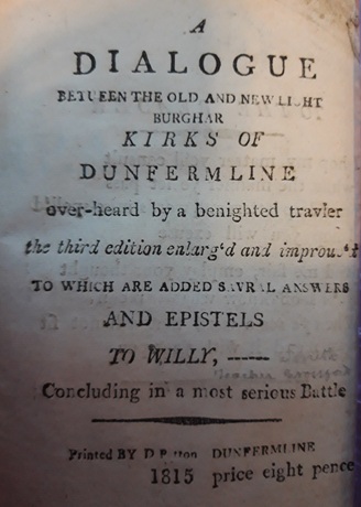 One of David`s publications proved problematic. In the early 19th century the Secession Church had split into Burgher and Anti-Burgher sects, and then into Burgher Old Licht (Light) and New Licht factions, who were bitterly opposed to each other. David originally favoured the Old Lights but found them too dogmatic and veered towards the New. In 1811 he had composed and printed 30 copies of a small book entitled (in transcription) `A Dialogue Betwixt the Old and New Burgher Kirks of Dunfermline overheard by a benighted Traveller, to which is Added An elegy on the Much Lamented death of The Rev. Mr Campbell, AM., 1811`.